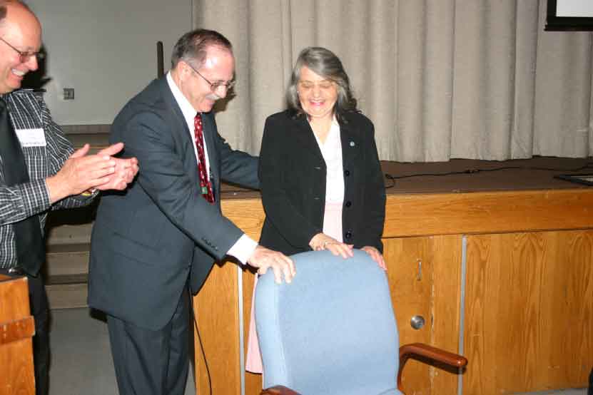 Kerman Mayor Ken Moore (left) applauds as City Manager Ron Manfredi gives retiring City Clerk Edith Forsstrom her office chair as a momento, during a retirement party.