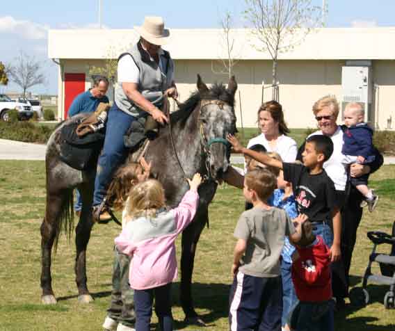 Students at Liberty School get a close up look at one of the horses in the wagon train.