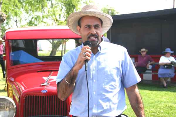 Amarpreet "Ruby" Dhaliwal, Mayor of San Joaquin, joined Fresno County Supervisor Phil Larson and Kerman Mayor Ken Moore at opening ceremonies for Kerman's 100th anniversary celebration, held April 29 in Kerckhoff Park.